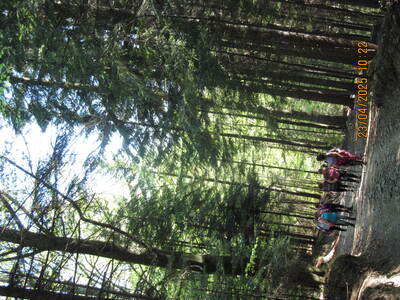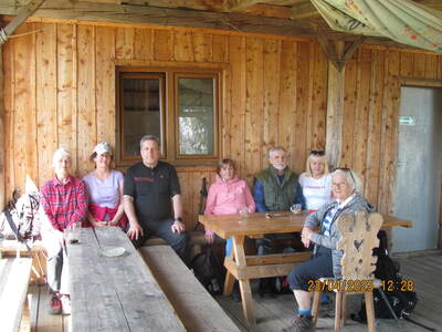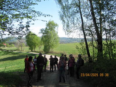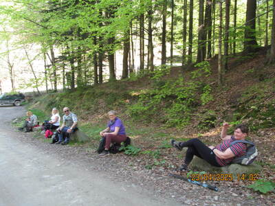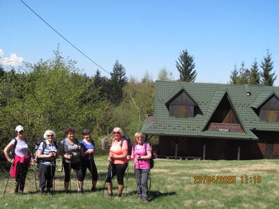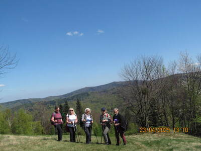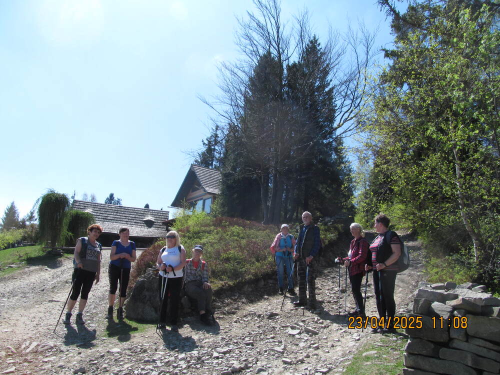 grupa miłośników pieszych wędrówek wyruszyła z Andrychowa do Rzyk‑Praciaków. Czarny szlak poprowadził ich przez osiedle Polaki oraz Kapliczkę nad Bolęciną do przytulnej Chatki Ani i Rafała, gdzie odpoczęli.