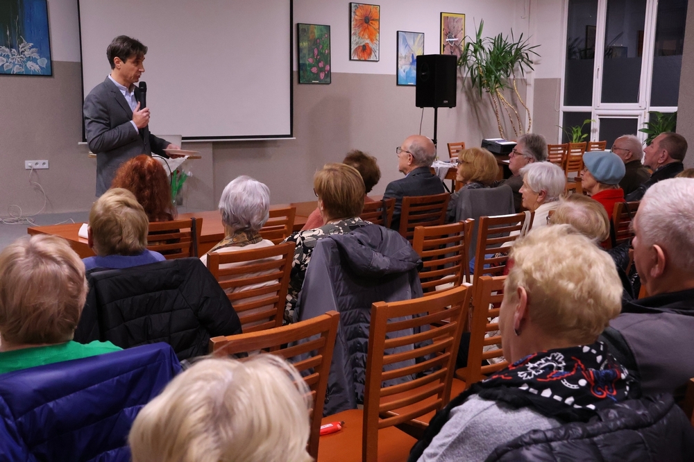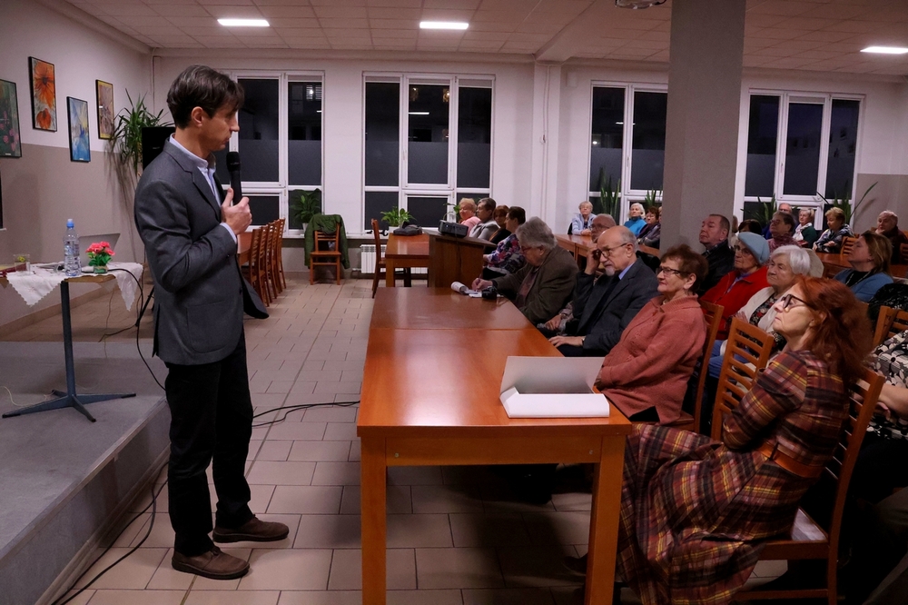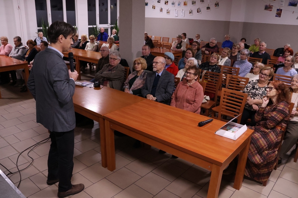 23 listopada 2023 - niecodzienne wydarzenie w naszym Uniwersytecie Trzeciego Wieku. Za sprawą koleżanki Krystyny Korbut-Płonka rozmiłowanej w literaturze polskiej, gościmy Hrabiego Macieja Szeptyckiego - potomka hrabiego Aleksandra Fredry. Nasz Gość przyjechał wraz z małżonką aby poprzez historię własną, przekazaną w sposób barwny i intrygujący poprowadzić nas po niezwykle ciekawej rodzinnej opowieści wzbogaconej archiwalnymi fotografiami i rekwizytami. Głównym bohaterem wieczoru był jednak ojciec polskiej komedii Aleksander Fredro, postać wielowymiarowa, mimo, że samouk- autor ponadczasowych utworów., które we współczesnym świecie są nadal grane na deskach teatrów, nie tylko europejskich. Choć Cyprian Kamil Norwid powie o nim "Najnieskończeńszym poetą polskim jest nie Mickiewicz, Zygmunt, Juliusz etc., etc., ale Fredro!!!". to jednak On uważał że najważniejszą rzeczą, jaką zrobił była walka o odzyskanie niepodległości Polski. Był między innymi: żołnierzem i wielkim patriotą walczącym w wojskach napoleońskich, odznaczony za zasługi złotym Orderem Virtuti Militari. Mimo, że jest to światowej sławy postać, twórca polskiej komedii, mający na swoim koncie niezwykły dorobek, nie tylko literacki, nie ma w swojej ojczyźnie muzeum. Pra -pra wnuk Aleksandra Fredry - Hrabia Szeptycki, w imieniu rodziny wziął sprawy w swoje ręce i założył rodzinną fundację mającą na celu kultywowanie dziedzictwa narodowego. Dziś jako inżynier, informatyk, od kilku lat rolnik wielkiego gospodarstwa wraz z żoną prowadzą Fundację Rodu Szeptyckich oraz tworzy Dom Komedii Aleksandra Fredry w Łaszczowie na Lubelszczyźnie, gdzie poprzez swoją działalność stara się ocalić od zapomnienia historię i twórczość poety .