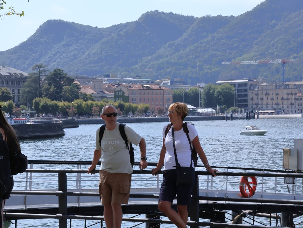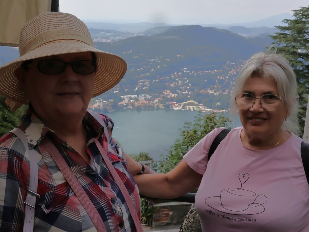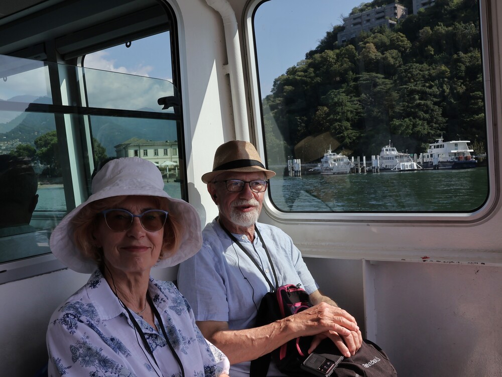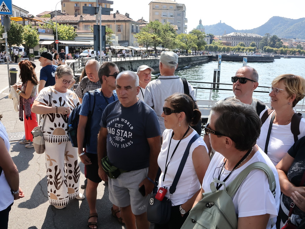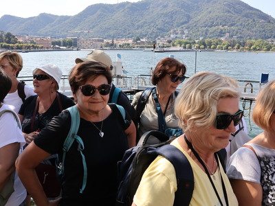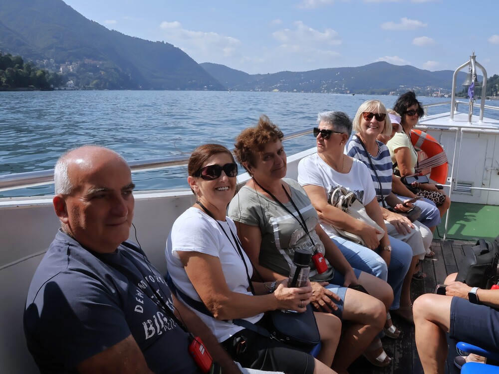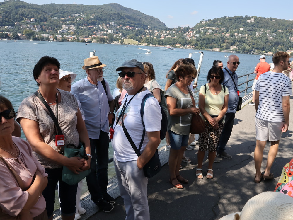 Dzień drugi przeznaczony był na całodzienną wycieczkę nad słynne jezioro Como. Niesamowite jezioro leżące u stóp Alp w Lombardii zachwyca turystów swoimi urokami. Nas także zachwyciło, zwłaszcza w czasie rejsu stateczkiem. Pilot zwrócił naszą uwagę na Tempio Voltiano, czyli klasycystyczny budynek zbudowany aby uczcić setną rocznicę śmierci wynalazcy żarówki Alessandro Volty. Po rejsie udało się nam wjechać kolejka na wzgórze (715 m n.p.m.) z miejscowością o tej samej nazwie Brunate, skąd podziwialiśmy panoramę miasta i jeziora. Potem spacerkiem przeszliśmy na Plac Katedralny Piazza del Doumo, znajdujący się w centrum Como. W drodze powrotnej zatrzymaliśmy się w miasteczku Lecco, by podziwiać jezioro z filiżanką pysznej kawy w ręku. Po obiadokolacji, mimo napiętego programu, Pani Prezes zorganizowała wieczór integracyjny, zespalając w idealną całość muzyka Leszka Ścibika, który z nami podróżował i biały błyszczący fortepian, który oczekiwał na nas w foyer hotelu. Wspólne śpiewanie naszej grupy zostało zauważone przez Włochów będących w hotelu, którzy zaczęli tańczyć i nagradzać nas brawami. Wspólnie z nimi zaśpiewaliśmy też włoska piosenkę.