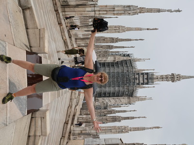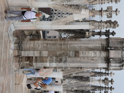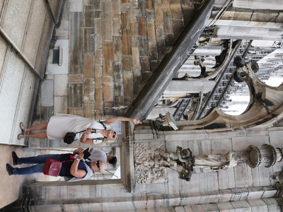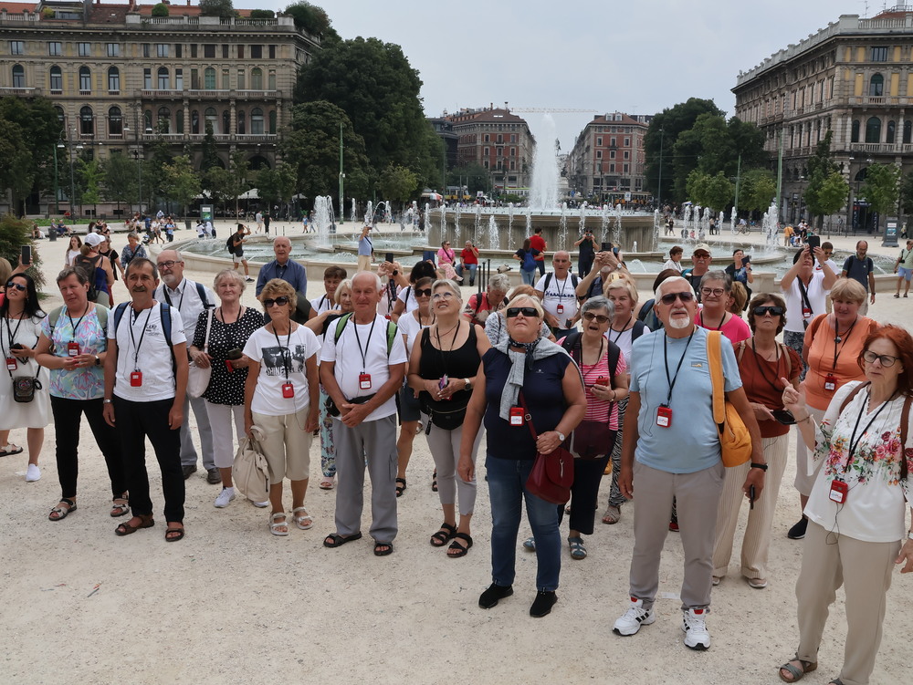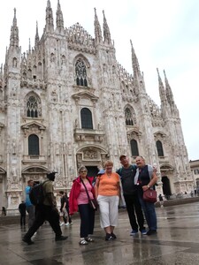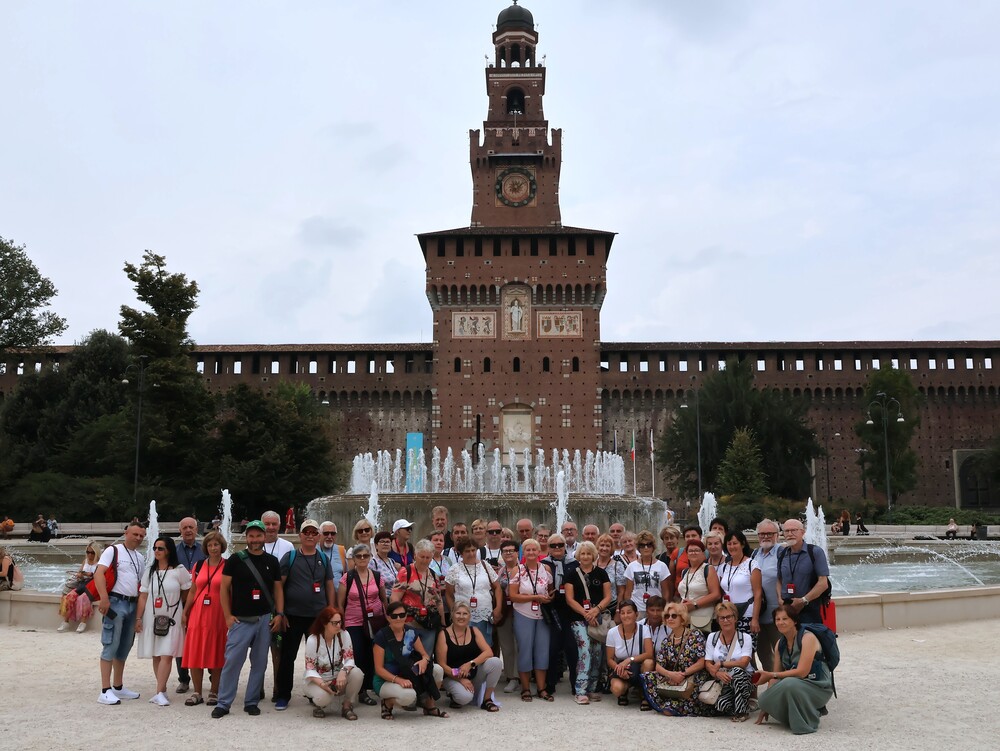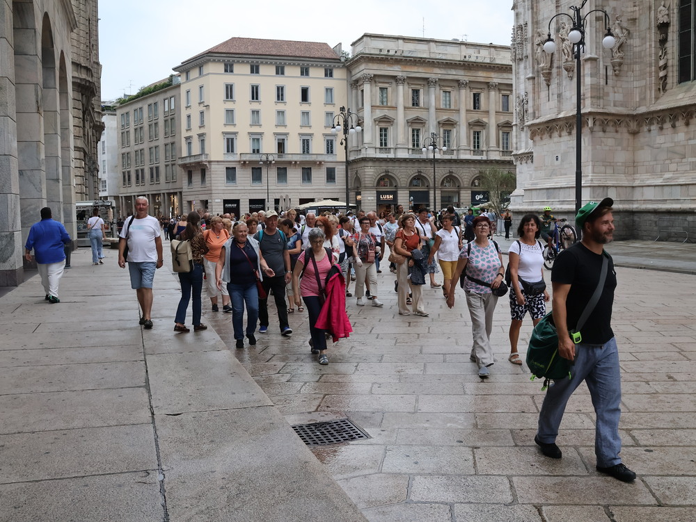 Kolejny dzień to wycieczka do Mediolanu. Zwiedzaliśmy miasto z miejscową przewodniczką. Mediolan - w Polsce głównie kojarzony ze stolicą mody, symbol włoskiego stylu i designu oraz siedziba dwóch słynnych klubów piłkarskich. Zwiedzanie miasta rozpoczęliśmy na dziedzińcu Zamku Sforzów, który zaprojektowany był jako budowla obronna wraz z Parkiem Sempione. Potem zobaczyliśmy takie obiekty jak Galleria Vittorio Emanuele II – najstarsza działająca galeria handlowa we Włoszech, Plac Leonarda da Vinci, na którym znajduje się La Scala – najsłynniejsza scena operowa w Mediolanie i jedna z najsłynniejszych na świecie, Plac Katedralny oraz Katedra Duomo – najważniejszy punkt w Mediolanie. Zachwyciła nas jej wspaniała fasada, ale wielkim przeżyciem był spacer po dachu i podziwianie ogromu, maestrii łuków przyporowych i pinakli zwieńczonych rzeźbami. Zaczęło padać, plac katedralny nabrał szczególnego charakteru.