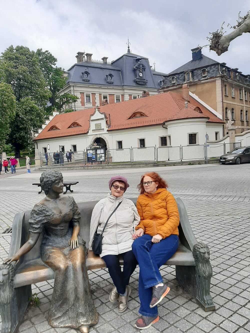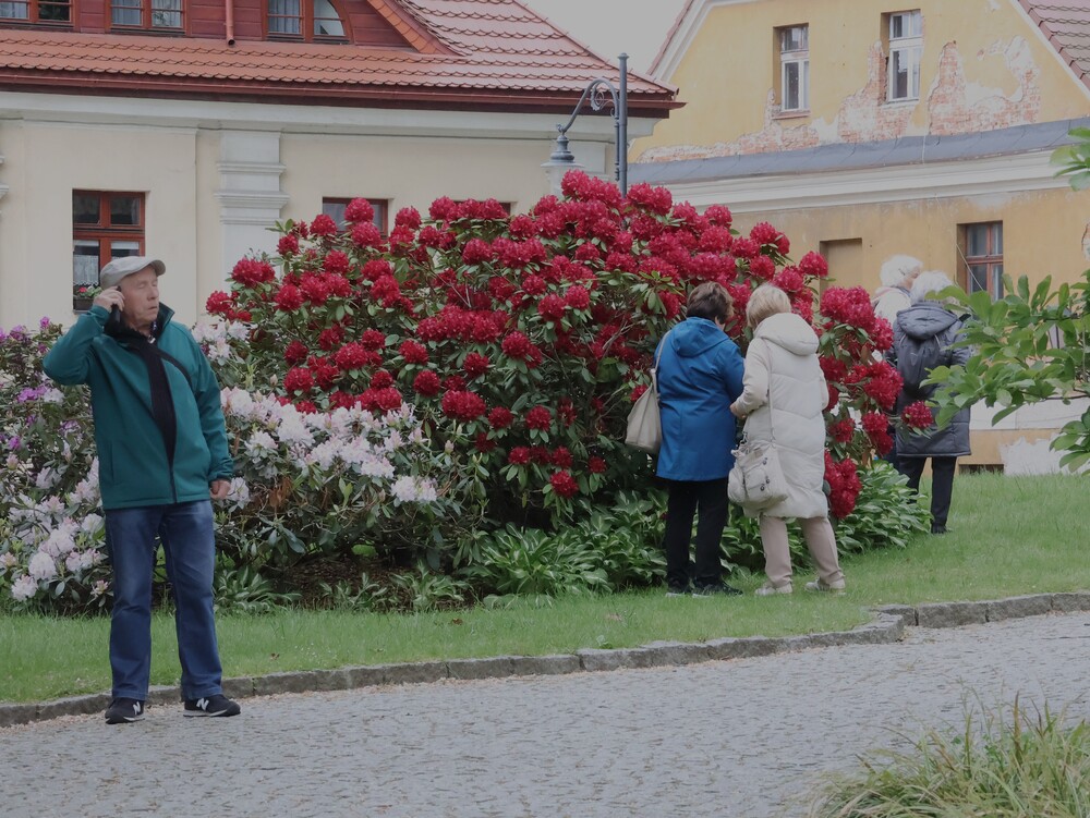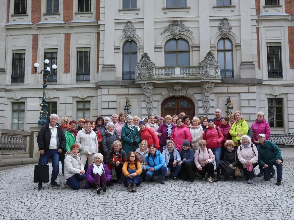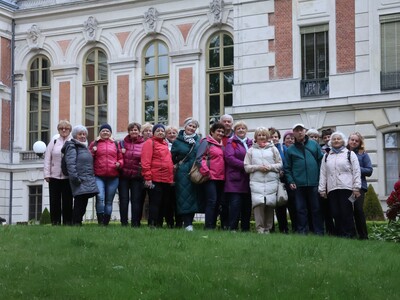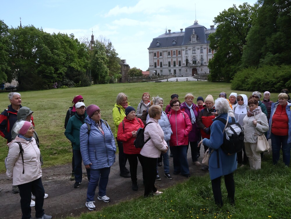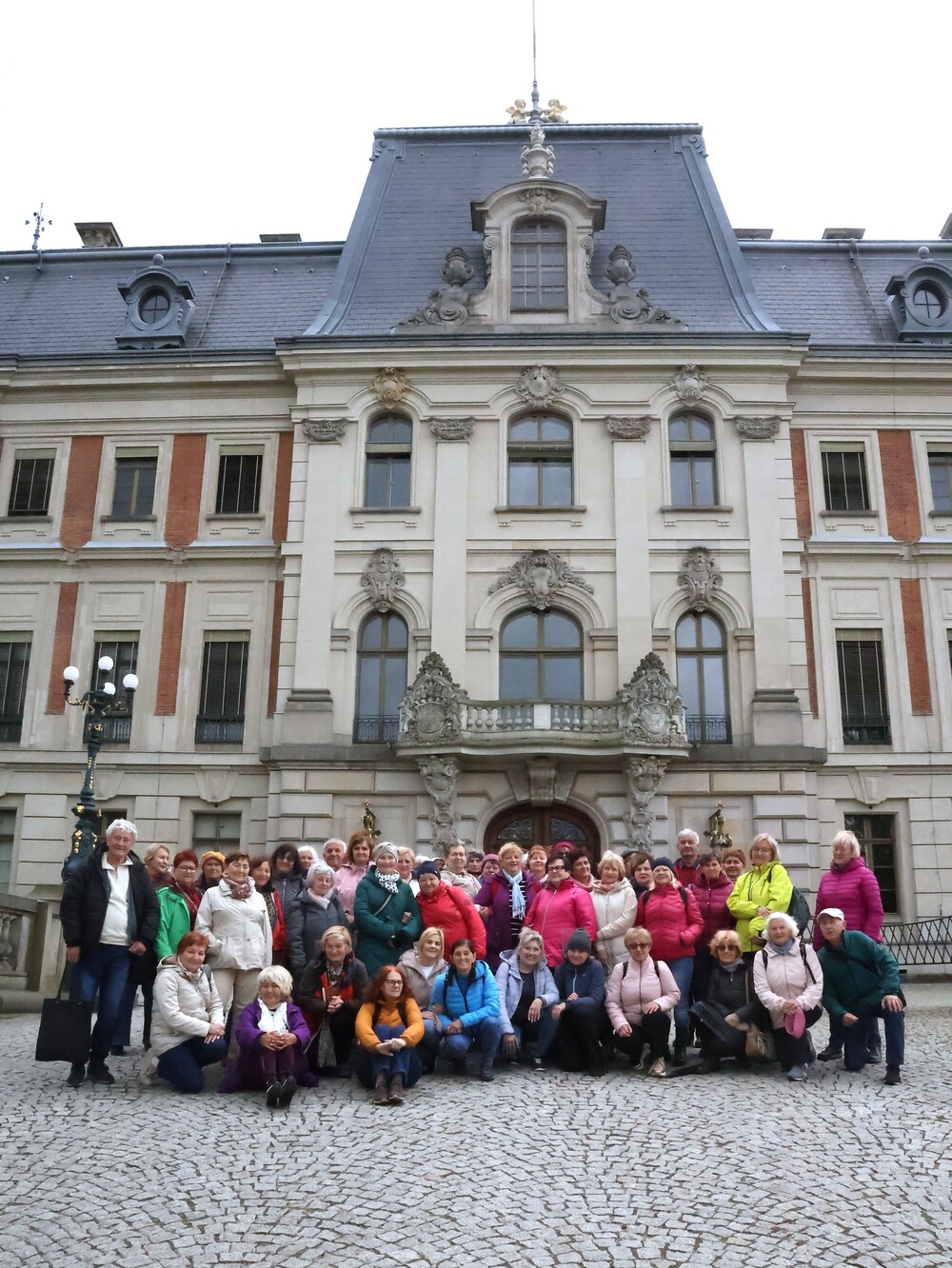 Na szczęście pogoda była (trzeba tu użyć słowa, ostatnio bardzo modnego) bardzo dynamiczna: deszczyk, deszcz, wiatr, ponure chmury i na odmianę rzęsiste słońce. Pierwszy punkt programu, to zamek/pałac w Pszczynie. Było nas na tyle dużo, że podzielono nas na dwie grupy. Olśniewające wnętrza, sala lustrzana, romantyczna historia księżnej Daisy, książę Bolko. Po zwiedzeniu zamku pierwsza grupa udała się do parku, a druga do Pokazowej Zagrody Żubrów. Pośród starodrzewu wybudowano pawilon edukacyjny prezentujący faunę charakterystyczną dla okolic. Oczekiwanie na karmienie żubrów urozmaicały nam wszędobylskie i dość hałaśliwe pawie. O umówionej godzinie dwie przewodniczki, po jednej dla każdej z grup, przejęły nas w celu oprowadzenia po Pszczynie i przybliżenia historii tego niezwykłego, śląskiego miasta, wpierw piastowskiego, potem czeskiego, wolnego państwa stanowego, niemieckiego i wreszcie polskiego. Przewodniczki i Pszczynę pożegnaliśmy w promieniach słońca, tuż po krótkiej ulewie. Ostatni punkt programu, Ogrody Kapias w Goczałkowicach-Zdroju, dopełniły wrażenia wyniesione z książęcego parku. Kapias, to nazwisko założycieli centrum ogrodniczego. Od 1979r., już trzecie pokolenie zajmuje się nie tylko biznesem, ale nieodpłatnym udostępnianiem ogrodów tematycznych: angielskiego, japońskiego, skandynawskiego, śródziemnomorskiego, romantycznego, wiejskiego, letniego, jesiennego, zimowego itd. To dobry przykład na połączenie życiowej pasji, biznesu i służby społeczeństwu. I znów, gdy wsiedliśmy do autobusu, by wyruszyć w drogę powrotną, dał o sobie znać deszcz. Teraz nie zrobił on już na nas wrażenia. Na koniec należy nadmienić, że koszty wycieczki były naprawdę niskie dzięki dofinansowaniu z projektu oraz środków własnych UTW.