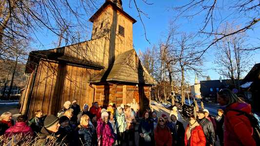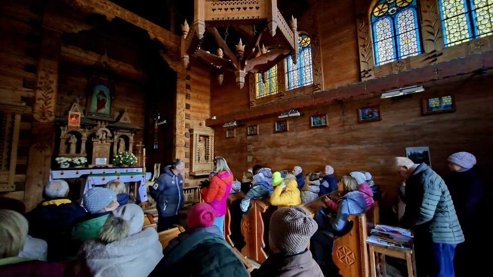 Następnie udaliśmy się na wieżę widokową Sky Walk w Poroninie. Dzięki wyjątkowo sprzyjającej pogodzie mogliśmy podziwiać zapierającą dech w piersiach panoramę Tatr oraz okolicznych miejscowości. Widoki zrobiły na wszystkich ogromne wrażenie i były jednym z najbardziej pamiętnych momentów wyjazdu. W drodze powrotnej odwiedziliśmy również kaplicę w Jaszczurówce – piękny przykład architektury zakopiańskiej, zaprojektowany przez Stanisława Witkiewicza.