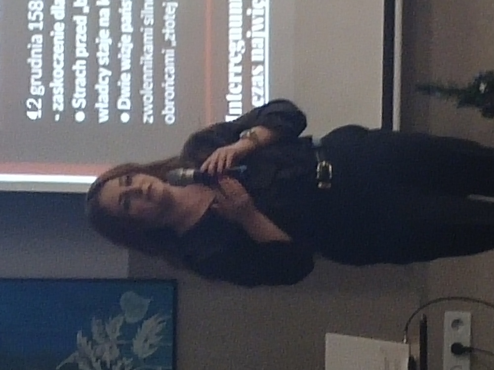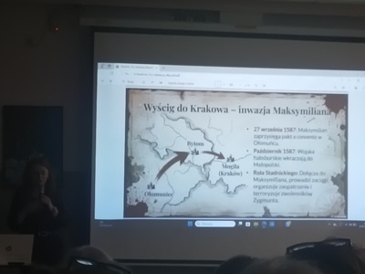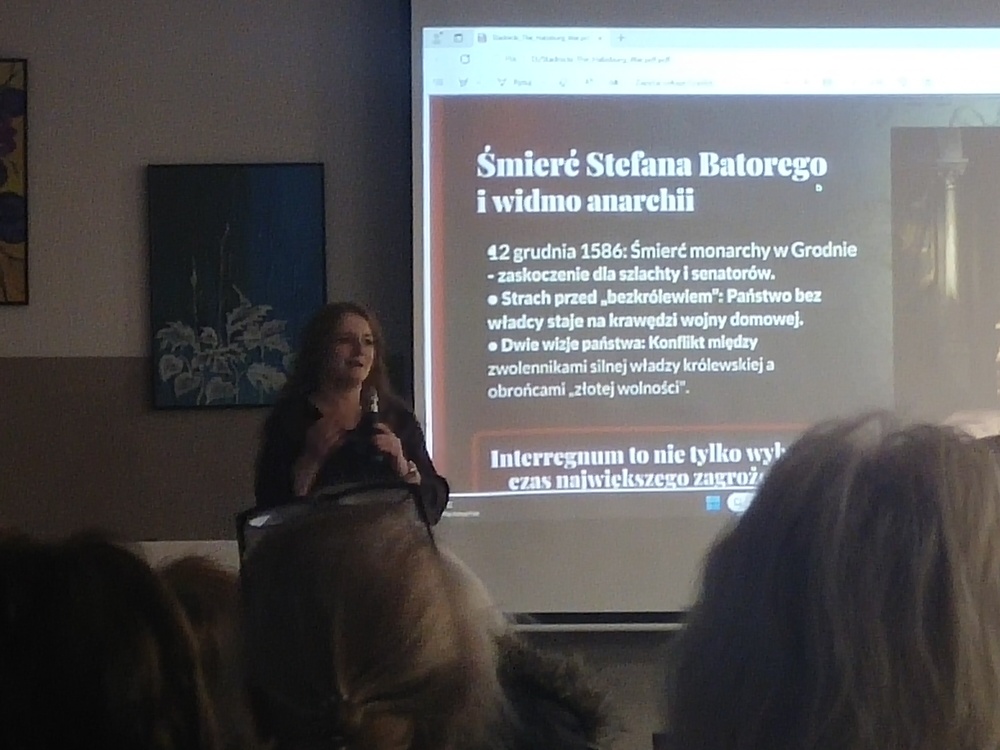 Pani Justyna wprowadziła nas w czasy XVI w. po śmierci Stefana Batorego. Jego śmierć była wielkim zaskoczeniem dla szlachty i senatorów. Panował strach przed bezkrólewiem i widmo anarchii czyli "ogień i miecz w dobie wolnej elekcji". Trwały zaciekłe walki między zwolennikami Jana Zamoyskiego i zwolennikami Rodziny Braci Zborowskich.