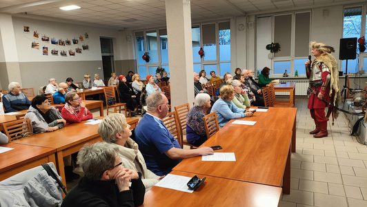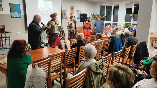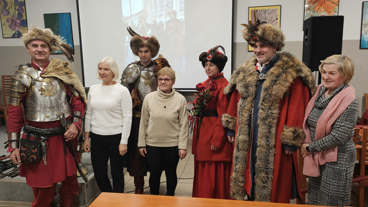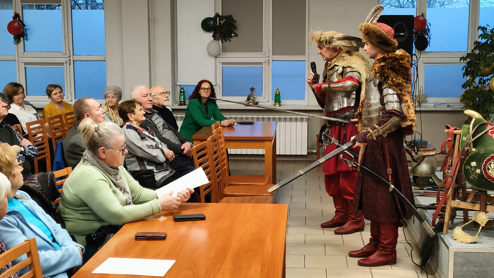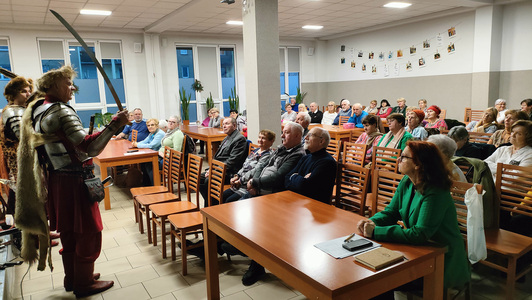 Goście przedstawili uczestnikom spotkania fragmenty historii z bitew i działań polskiej husarii. Dużym zaiteresowaniem cieszyły się: ubiory, zbroja, szabla , miecz i karabela. Każdy z obecnych mógł dotknąć "historii" - potrzymać w ręku buławę hetmańską, sprawdzić ciężar kuli armatniej, dotknąć i powąchać dziegciu, potrzymać chorągiew i założyć futrzaną czapę z piękną, ozdobną broszą. Nasi goście podzielili się również swoją największą pasją jaką są ich konie. O koniach mogą mówić godzinami i dlatego przekazali zebranym kilka ciekawostek o koniach i wyjaśnili pochodzenie niektórych powiedzeń takich jak: konia z rzędem, strzemienny czy końskie zdrowie.